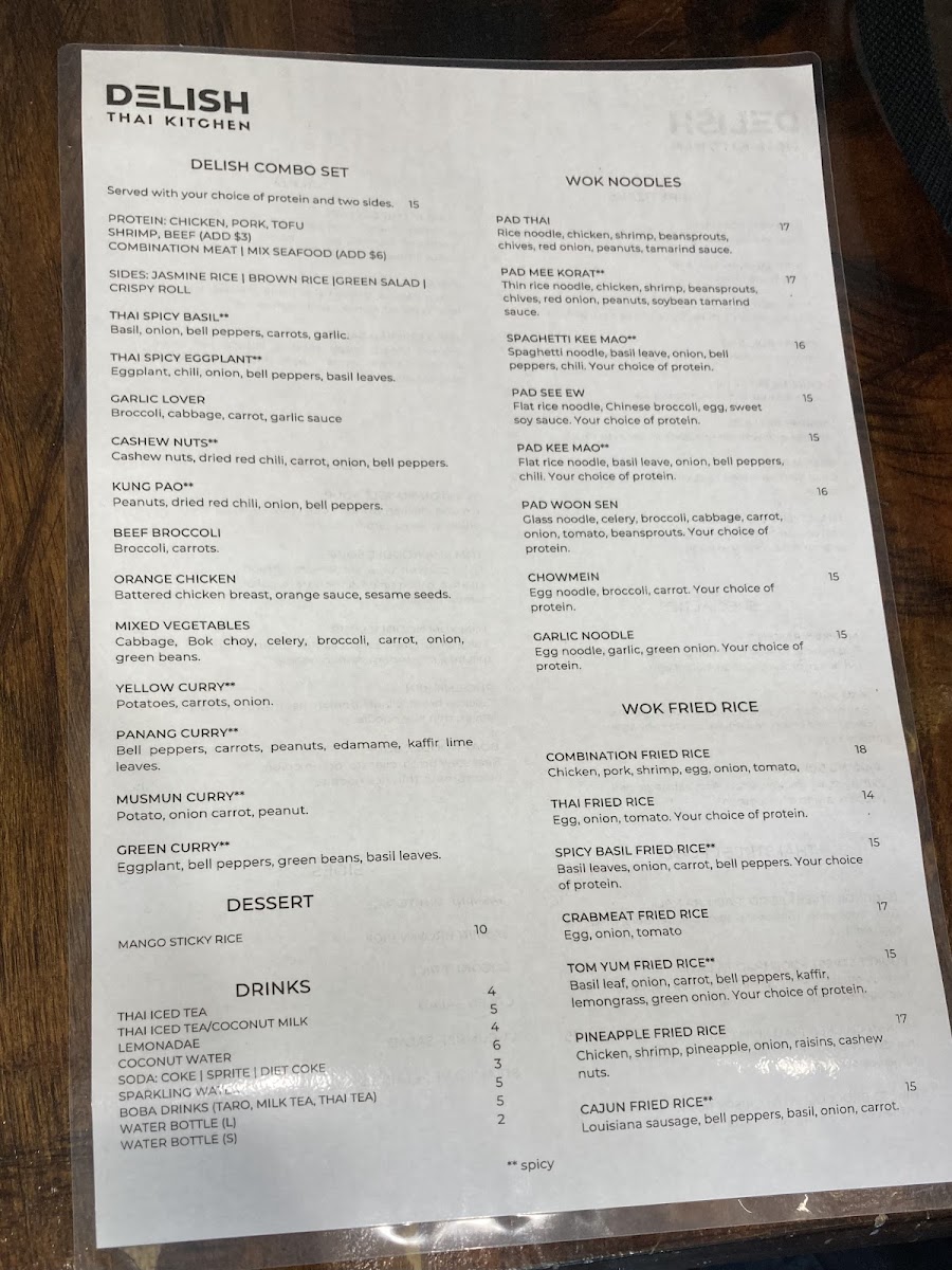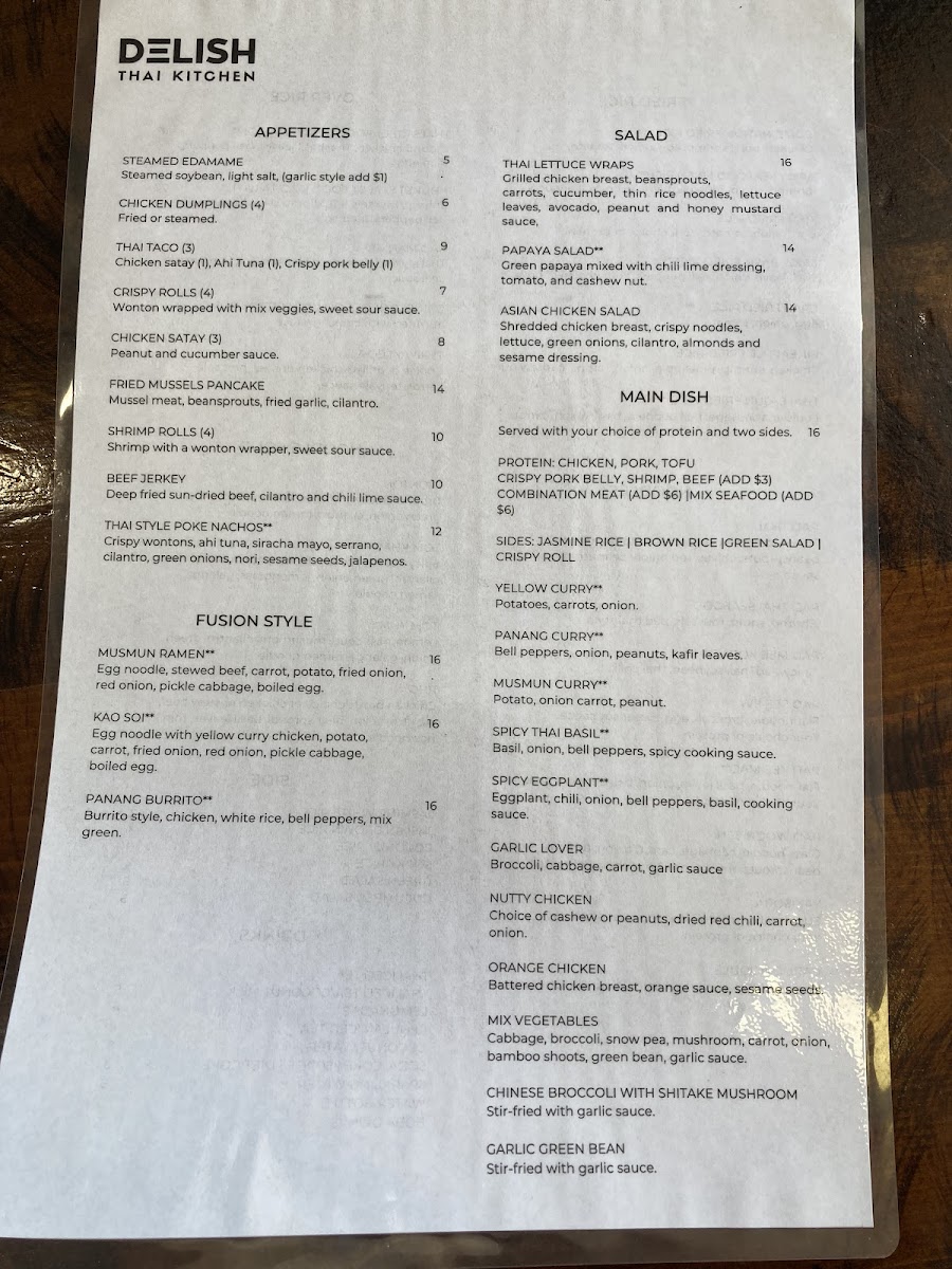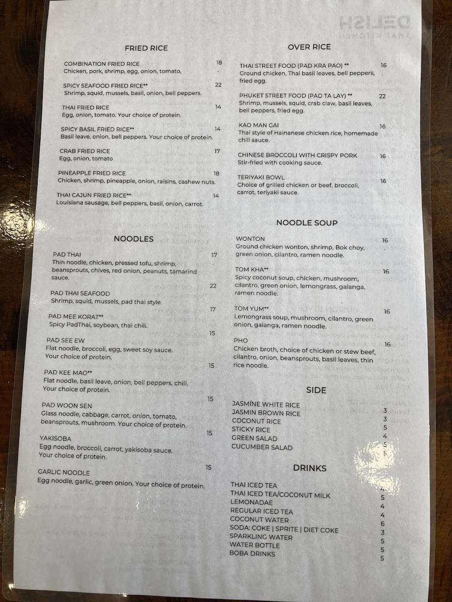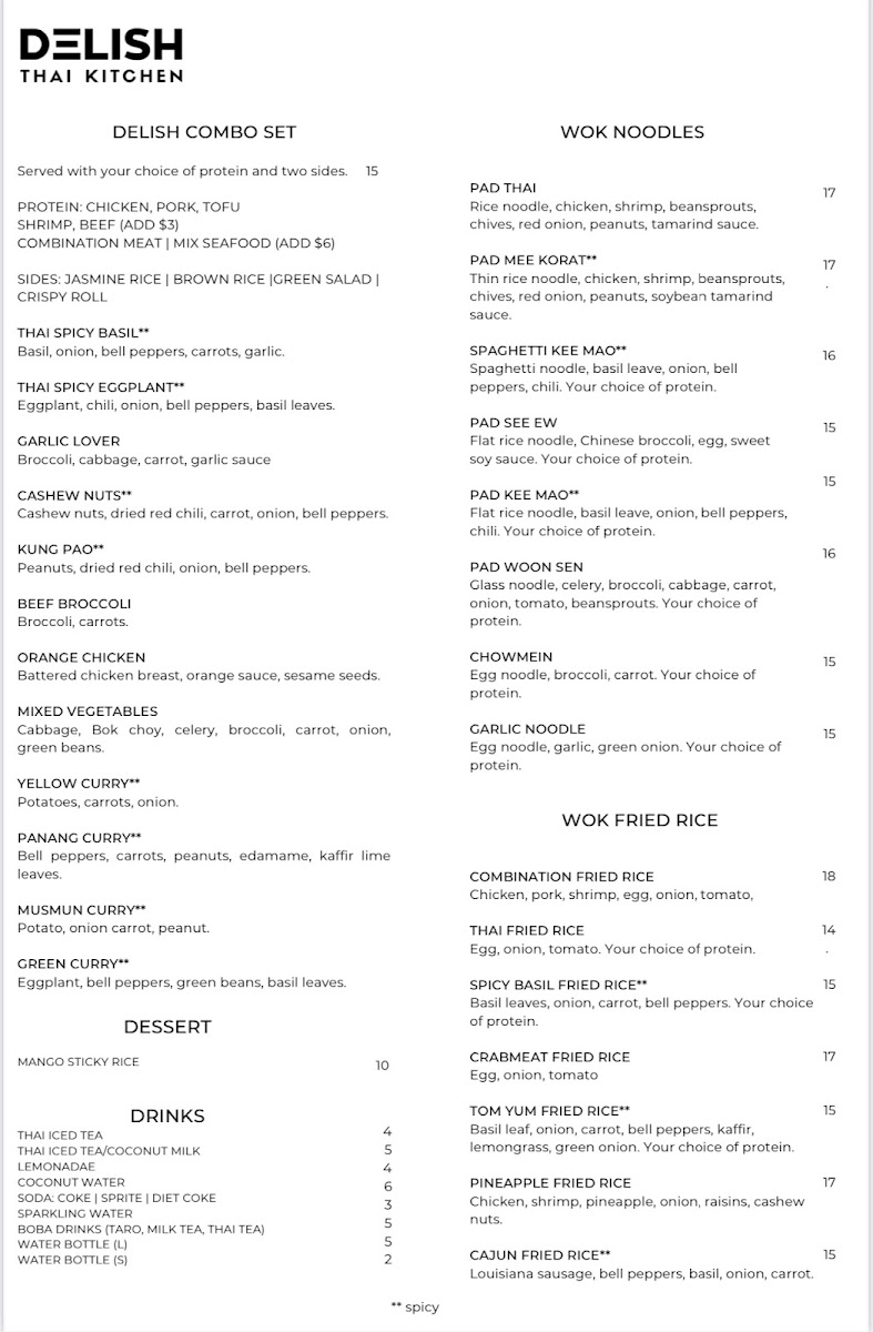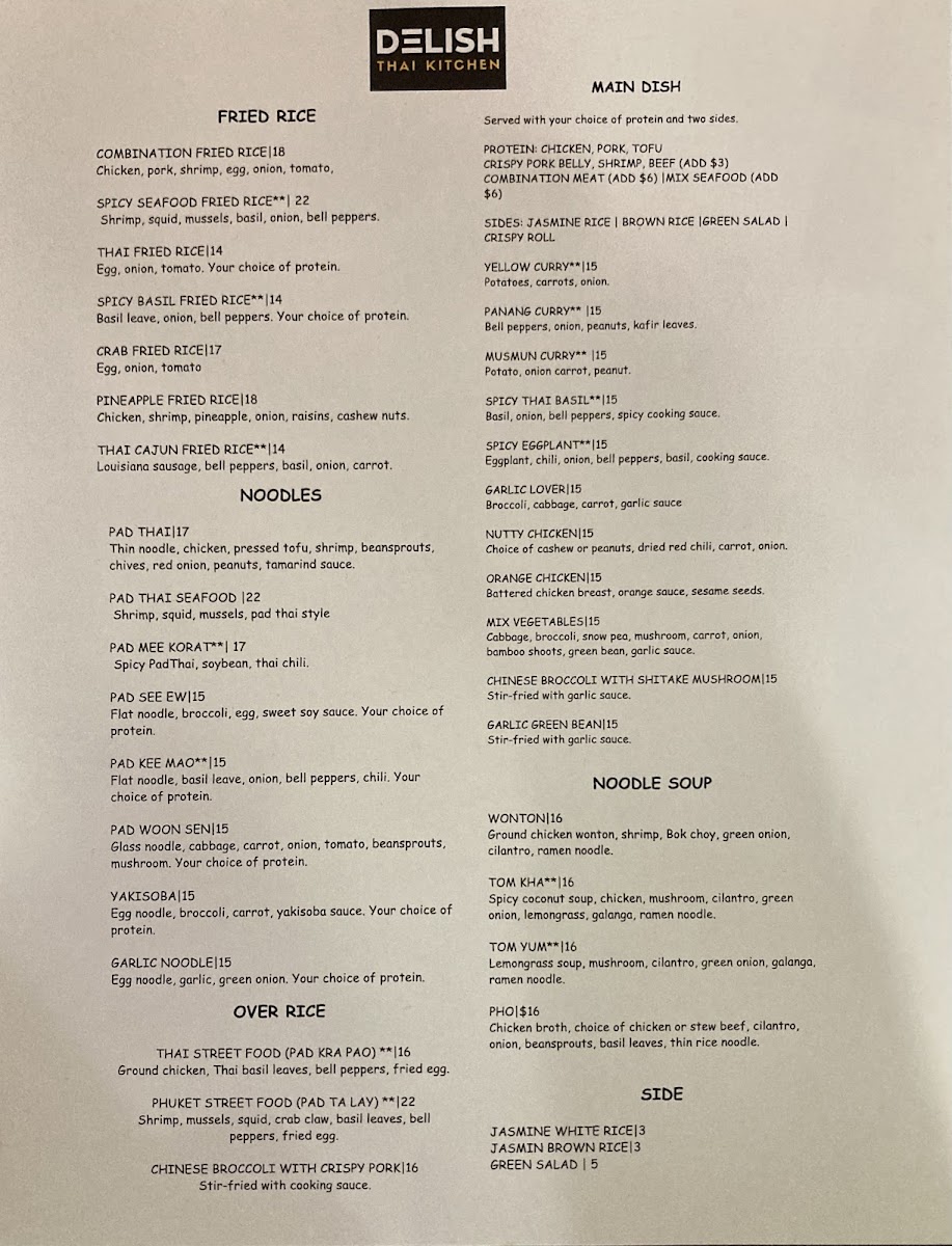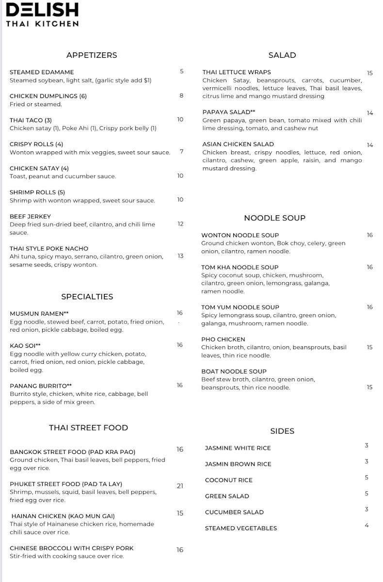The menu is packed with options, including classic favorites like Pad Thai, rich coconut curries, and mouthwatering appetizers like spring rolls and satay. Whether you're in the mood for something light or a hearty meal, there’s something to satisfy every craving. The cozy atmosphere of Delish Thai Kitchen makes it the perfect place to enjoy these delicious dishes with friends or family.